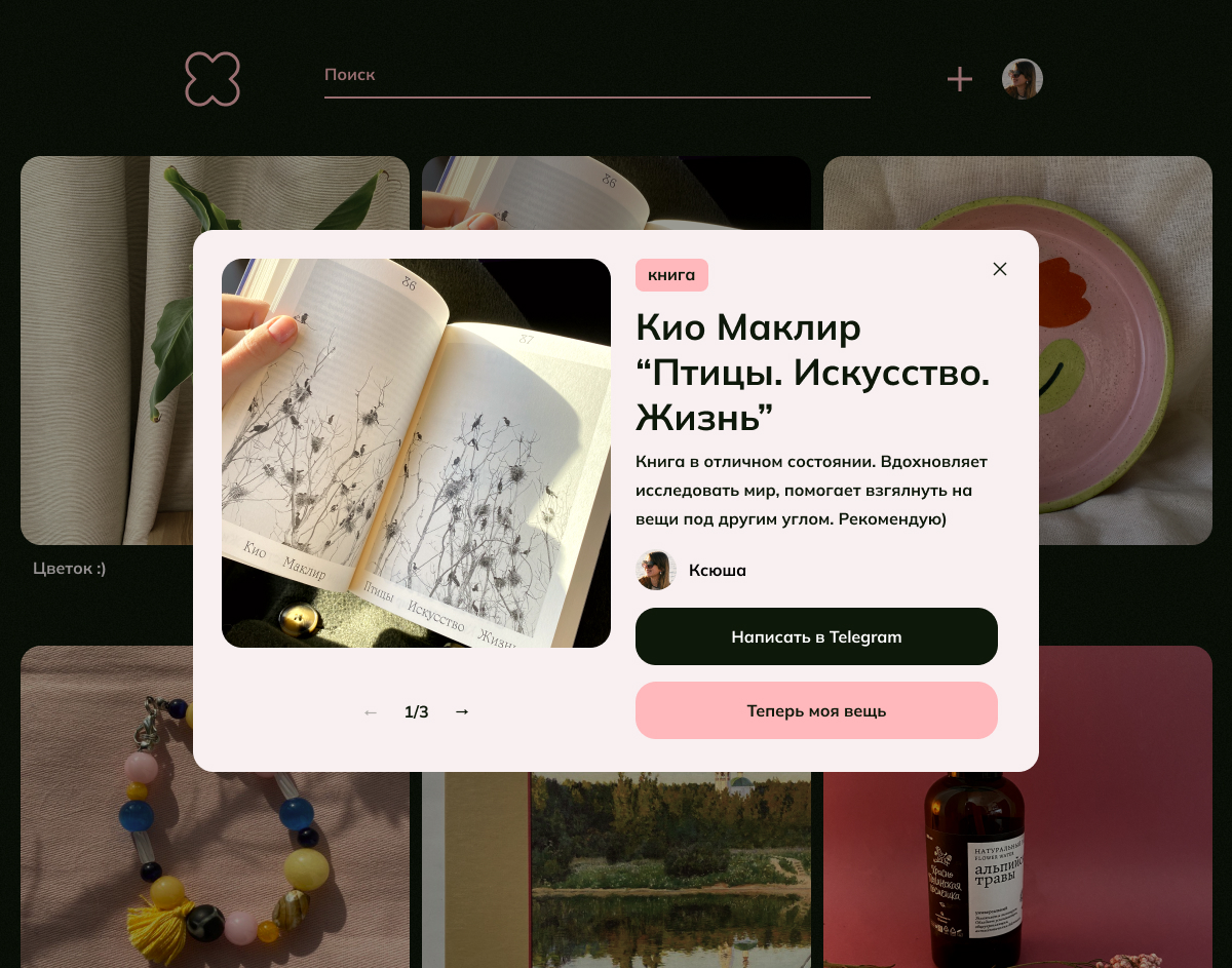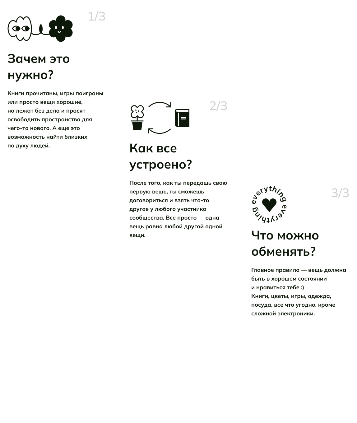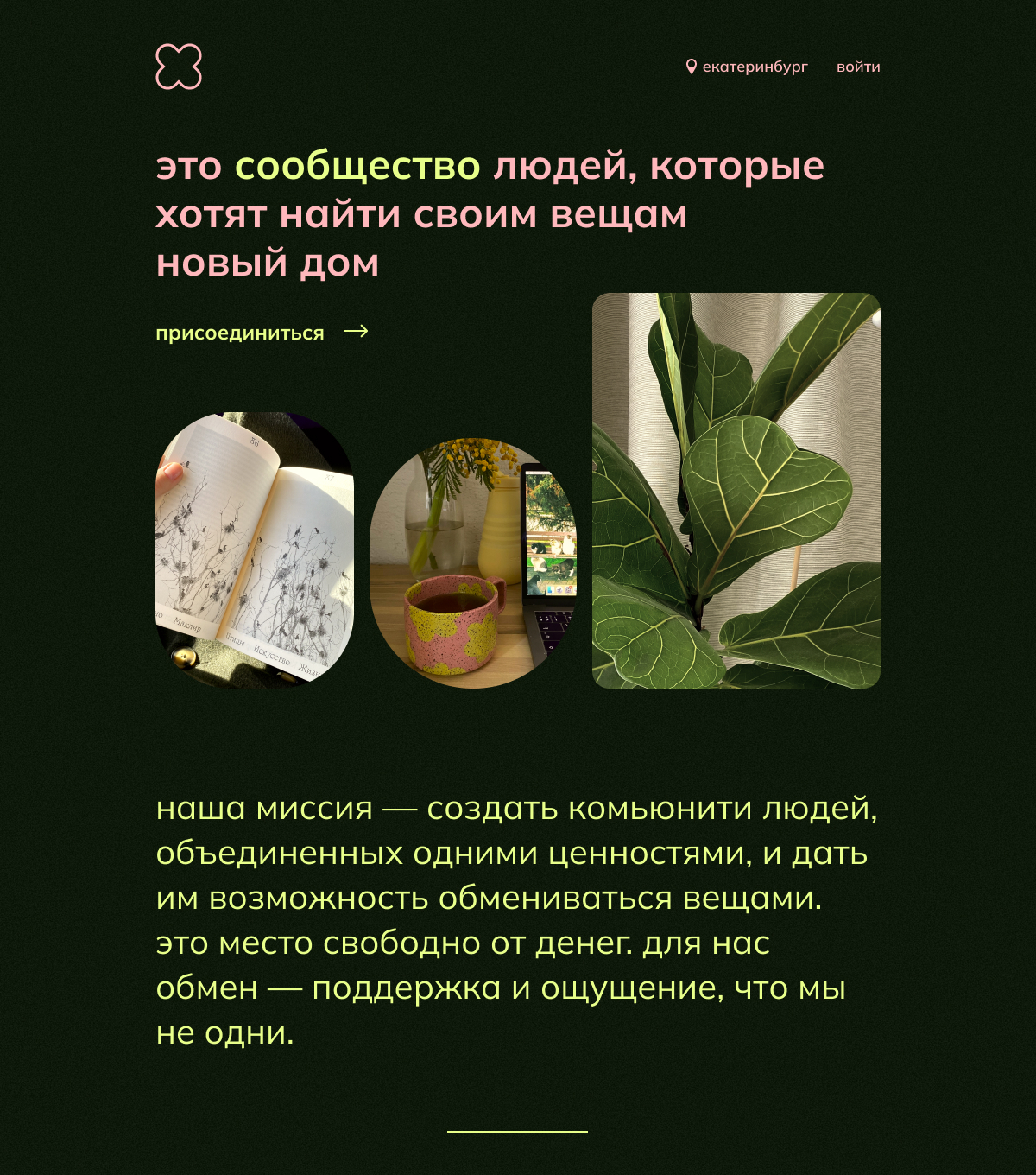 I created the design and mechanics for the web version and app. To join the community, you need to tell a little about yourself. In response, the moderators will send you a code. After that, you can post items for exchange. You can meet and hand over the thing in person and drink coffee, for example, or you can send it by delivery around the city.